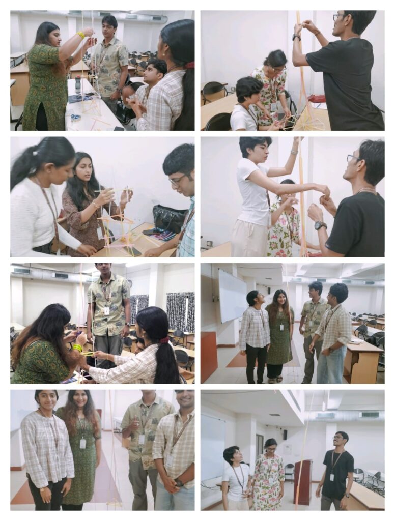 The “Adaptive Collaboration Challenge: Tower Building Under Constraints” was designed as an experiential learning activity to deepen students’ understanding of group dynamics through real-time application. Conducted in teams, the activity required participants to construct the tallest free-standing tower using limited materials within a fixed time. What made the exercise pedagogically innovative was its phased design, where progressive constraints—such as blindfolding a team member and restricting verbal communication—were introduced. These simulated real-world uncertainties and disruptions, encouraging students to adapt their strategies, assume flexible roles, and navigate challenges collaboratively.