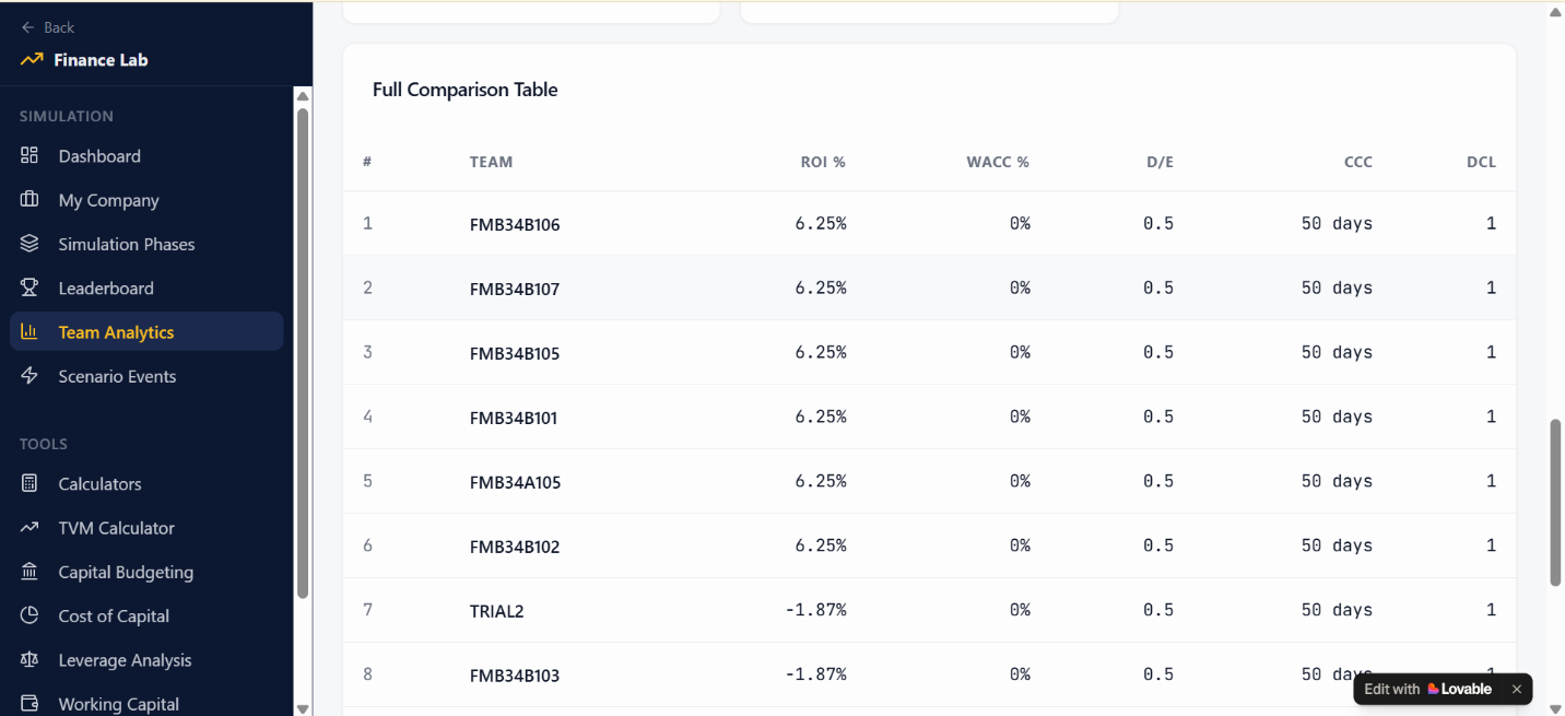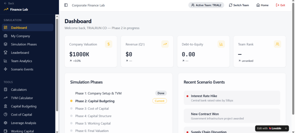 Rather than learning concepts in isolation, students progressively build on their decisions, understanding the interdependencies between investment, financing, risk, and returns. This approach encourages critical thinking, analytical rigor, and strategic decision-making under realistic business conditions.