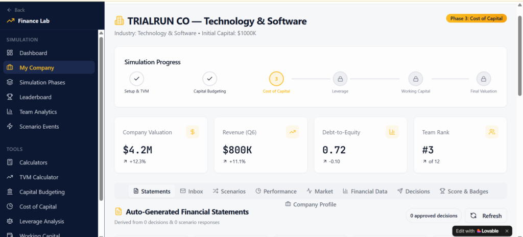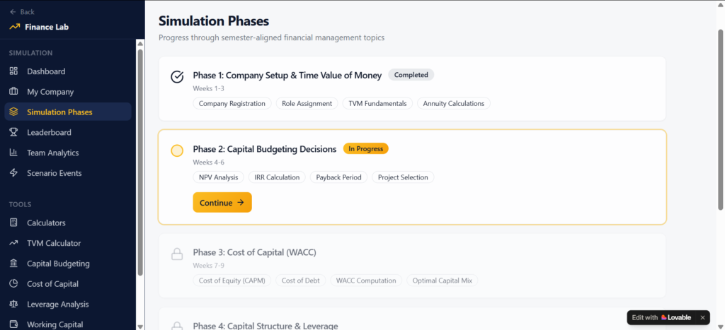 The simulation unfolds through a series of structured phases—Foundation, Planning, Investment, Financing, Cost of Capital, Leverage, Dividend, Working Capital, and Final Integration. Each phase focuses on a key financial domain and requires students to generate specific outputs, including a Company Blueprint, Financial Plan, Project Evaluation, Funding Strategy, Capital Cost Report, Risk Analysis, Policy Note, Working Capital Plan, and a final integrated financial portfolio with presentation.