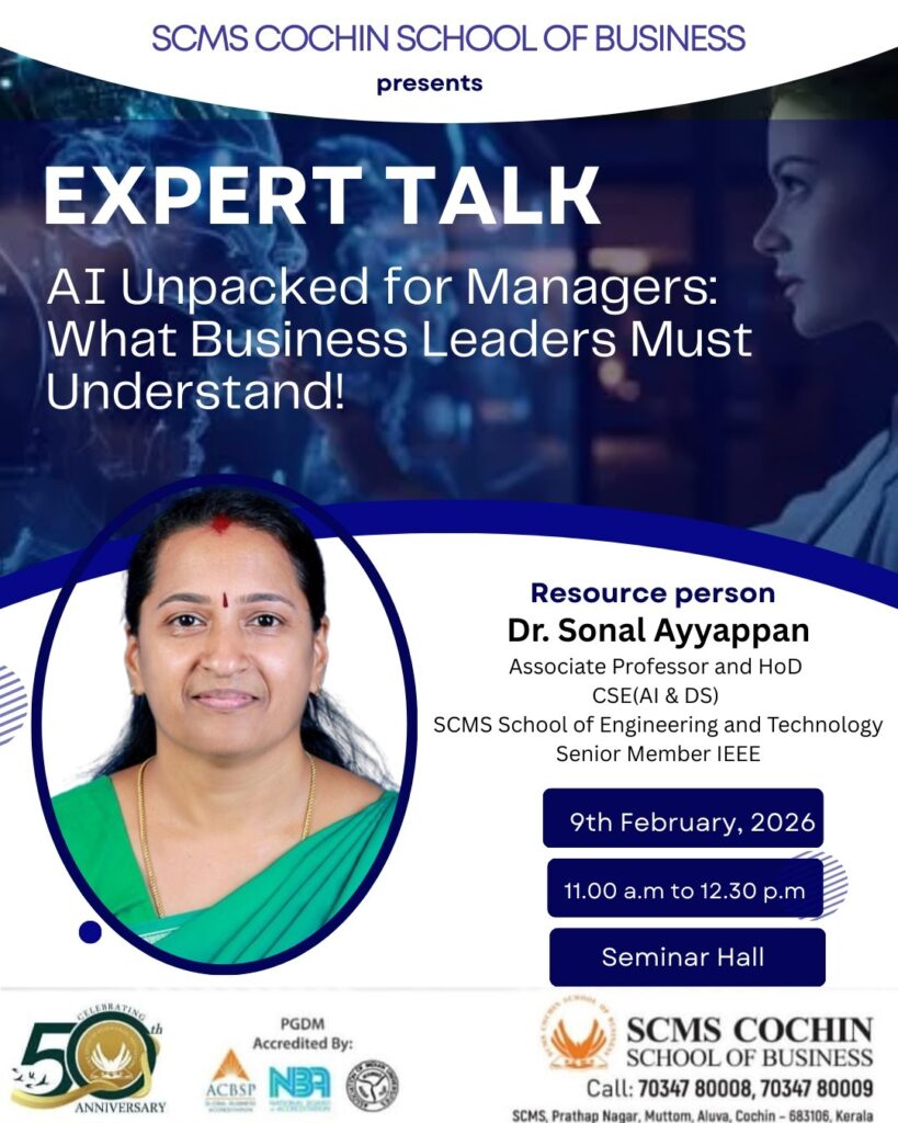 SCMS Cochin School of Business organized an insightful Expert Talk on “AI Unpacked for Managers: What Business Leaders Must Understand” on 9th February 2026 in the Seminar Hall.