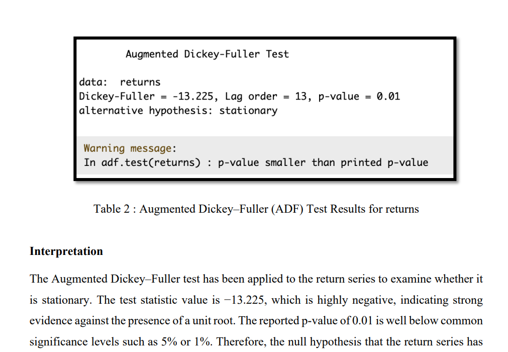 Students actively work with R Studio and Python to perform data cleaning, transformation, and visualization using actual stock price data of companies. The learning process goes beyond basic analysis, requiring students to standardize datasets and apply key time-series techniques such as testing for stationarity and autocorrelation—critical steps in financial forecasting and stock price prediction. Additionally, forecasting models such as ARIMA were implemented using R Studio, enabling students to gain hands-on experience in time series forecasting with real-world financial data.